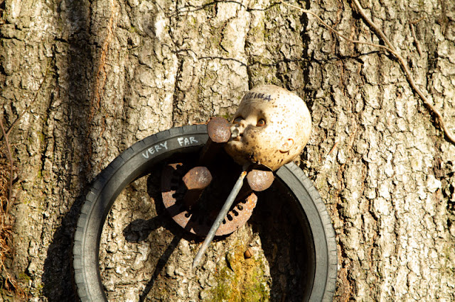 Located on the site of an abandoned 19th-century brick factory, the nature preserve was bought by Dekalb County in 2003, and they began constructing trails. The Doll’s Head Trail itself is the creation of a local carpenter, Joel Slaton, who envisioned an art project created from discarded doll parts and other trash scattered around the site. For some reason, the site had been used as a dumping ground for years, and flooding also, somehow, produced more art objects - one source said from homes that were flooded. Slaton turned it all into a found art experience, and he encouraged visitors to make their own contributions, but only objects found on the site – not brought in from outside. As the sign on the trailhead says, “Litter makes the angels cry.”